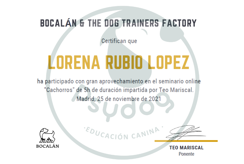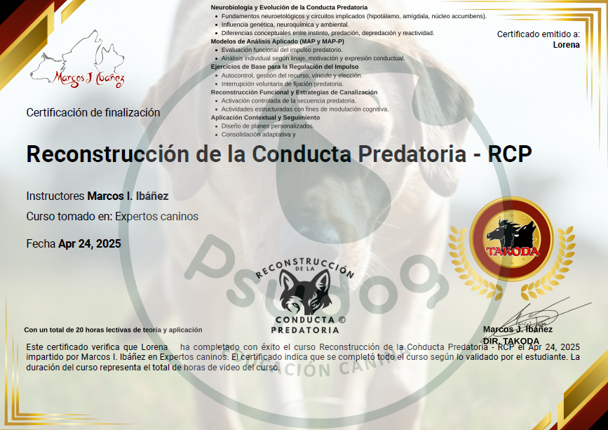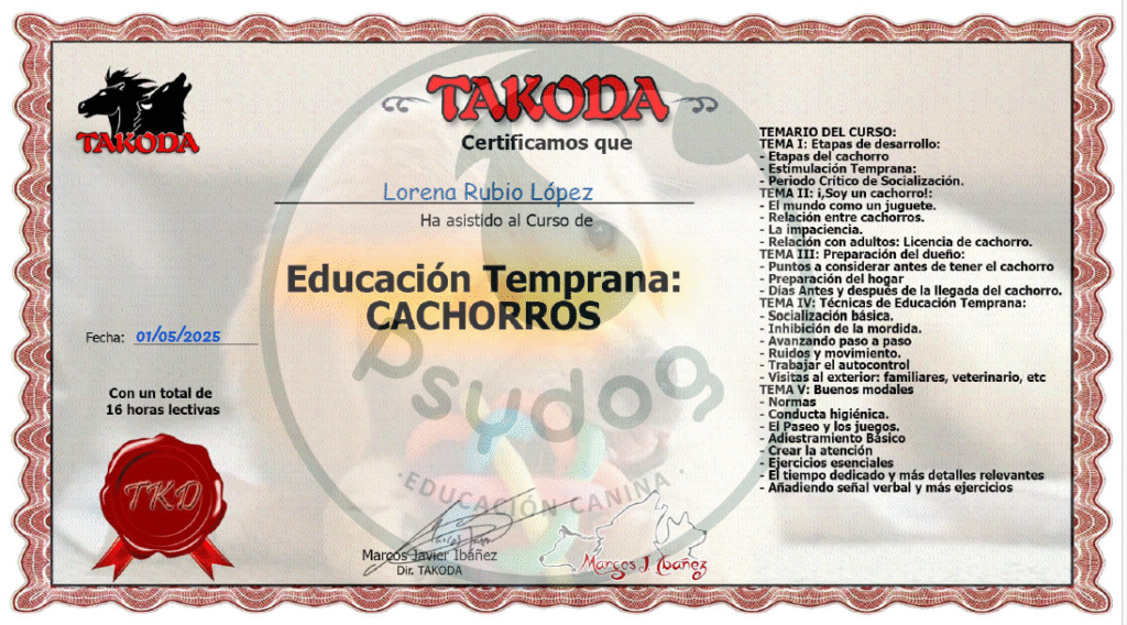 Todo esto sin contar otras formaciones especializadas como: Conducta Predatoria de Marcos J. Ibáñez, Cursos y seminarios sobre Educación de Cachorros (Por Marcos J. Ibáñez), Lenguaje y fenotipos funcionales (Rumbo Canino) canino o cursos sobre Conducta Olfativa con Mónica Corchado.